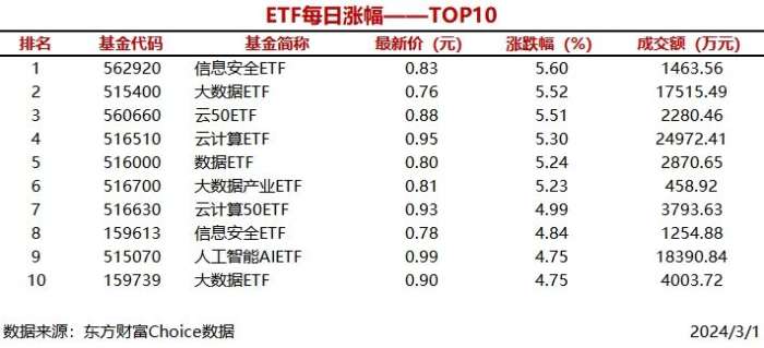6只ETF涨幅超过5% 信息安全ETF上涨560%