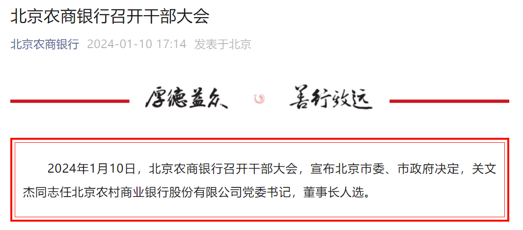北京农商银行官方微信公众号显示,2024年1月10日,北京农商银行召开干部大会,宣布北京市委、市政府决定,关文杰同志任北京农村商业银行股份有限公司党委书记,董事长人选。财务报告显示,去年三季度末,北京农商银行资产规模首次破1.2万亿。