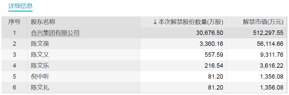 解禁市值第二大的合兴股份解禁股东为合兴集团有限公司、陈文葆、陈文义等6个股东,分别为合兴股份第一、第二、第三大股东,其中陈文葆为合兴股份实际控制人。