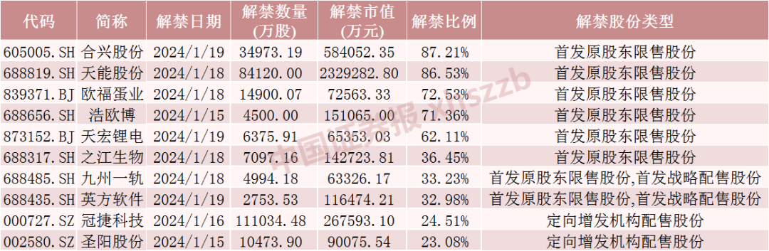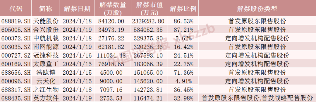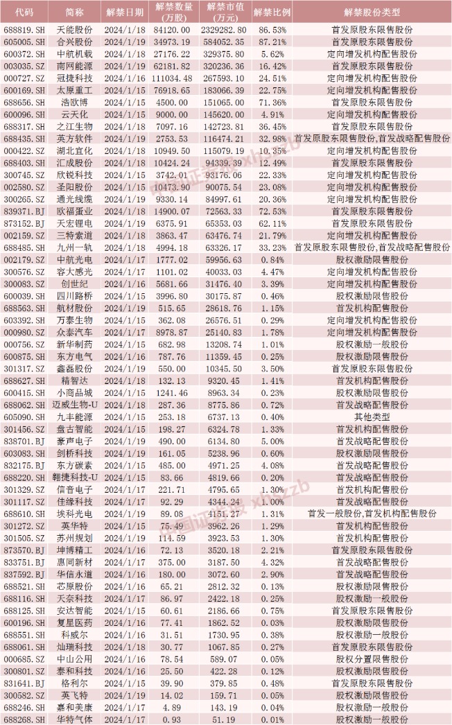 具体来看,数据显示,天能股份1月18日将解禁8.41亿股,均为首发原股东限售股份。合兴股份1月19日将解禁3.50亿股,均为首发原股东限售股份。中航机载1月18日将解禁2.72亿股,均为定向增发机构配售股份。南网能源1月19日将解禁6.22亿股,均为首发原股东限售股份。
