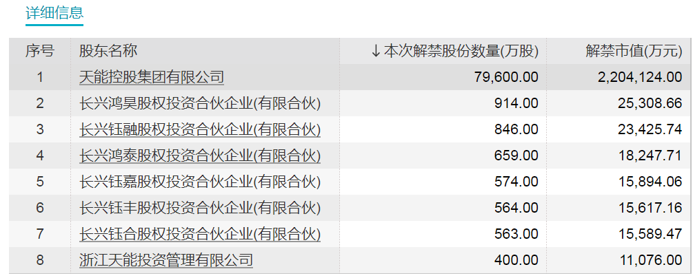 具体来看,在下周面临解禁的58只股票中,解禁市值最大的天能股份解禁股东为天能控股集团有限公司、长兴鸿昊股权投资合伙企业(有限合伙)、长兴钰融股权投资合伙企业(有限合伙)等8个股东,分别为天能股份第一、第三、第四大股东。