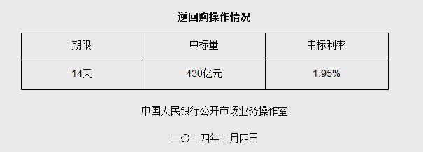 中新网2月4日电据中国人民银行网站消息,为维护春节前流动性平稳,2024年2月4日人民银行以利率招标方式开展了430亿元14天期逆回购操作。具体情况如下: