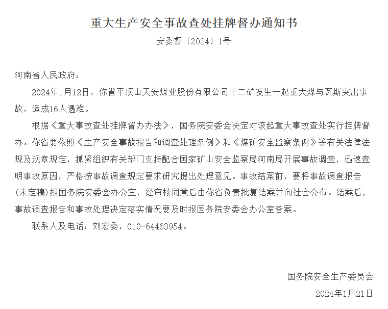 新京报讯据应急管理部消息,1月22日,国务院安全生产委员会发布重大生产安全事故查处挂牌督办通知书。以下为全文: